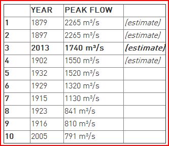 UPDATE: A crushing blow to the climate change propagandists: We are informed by the Weather Network that before the 2013 flood, the eight worst recorded floods in Alberta history occurred before 1933. In 1879 and 1897, the floods were about 35% worse.