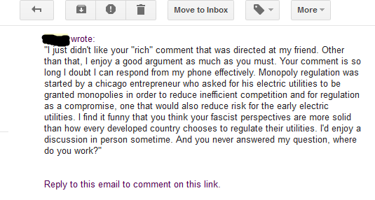 A quick tangent: The fascist reference is pretty hilarious. The guy who opposed to monopolies propped up by state regulators is the fascist. Not the bureaucrat who wants to run the economy his way. Not the firms who capture regulators to preserve their monopolistic advantages.